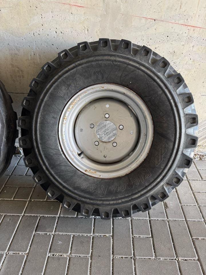 Een paar voorbanden met velgen. Dit zijn 10.00-16 banden gemonteerd op Lemmerz velgen.